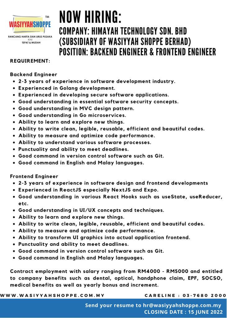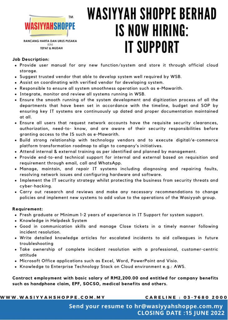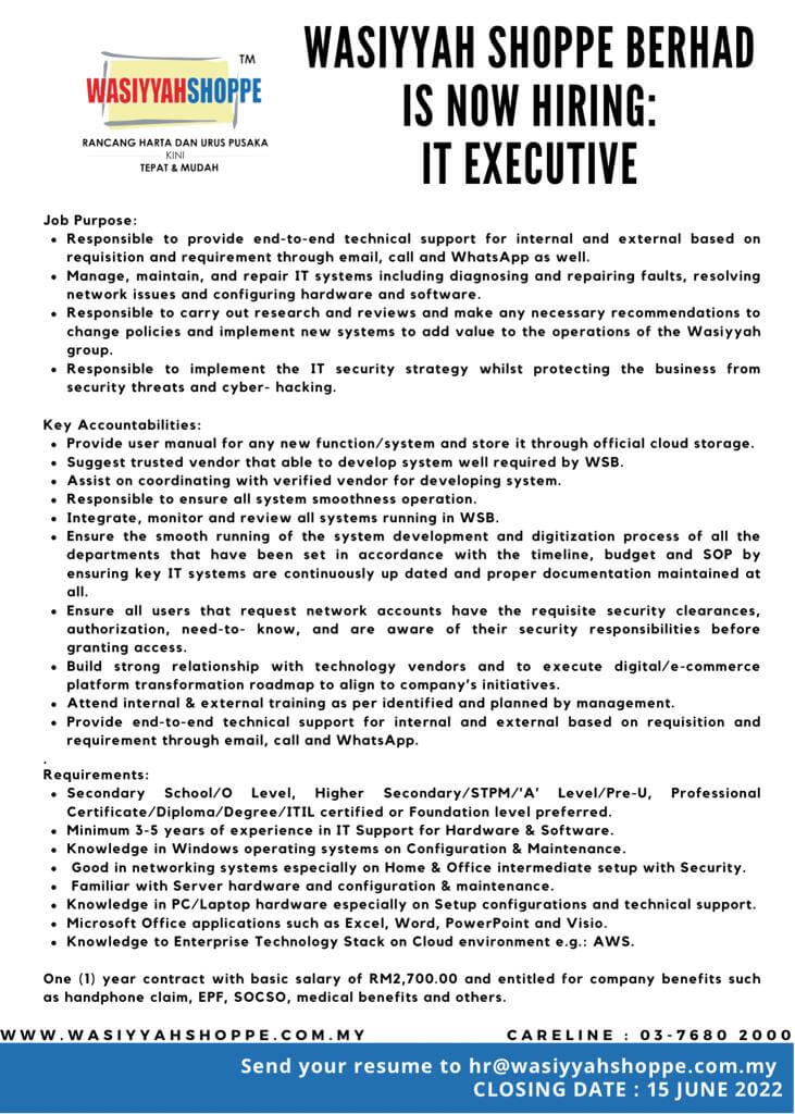 Send your Application to hr@wasiyyahshoppe.com.my before 15 JUNE 2022